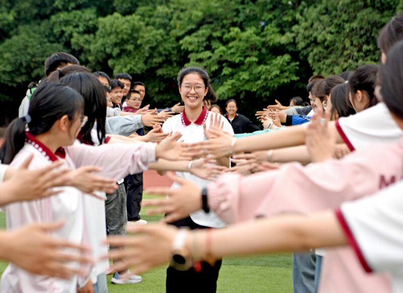 高考臨近,我市組織高三學(xué)生開展不同形式的減壓活動,幫助學(xué)生放松心情,迎接高考。圖為5月26日,淮南一中高三學(xué)生在操場上參加“擊掌加油”減壓游戲,放松心情迎接高考!