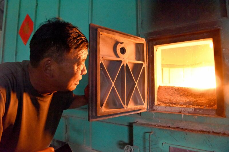 徐懷彪查看小麥烘干機(jī)內(nèi)燃料自動投放情況。