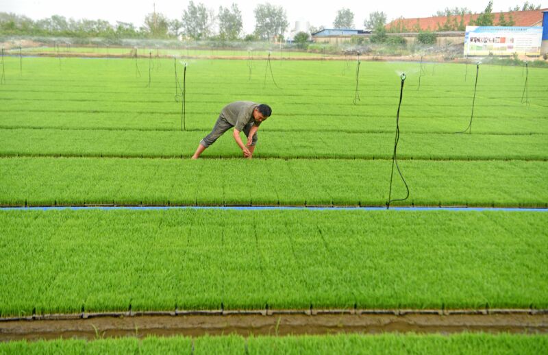 記者看到,倉庫的外側(cè)是面積約20畝的水稻育秧基地,秧苗可以滿足3000畝的水稻種植,其中有1500多畝是周邊村民的?臻e的時間里,徐甲甲既要查看育秧情況,還要操作植保無人機(jī)播撒農(nóng)藥。“忙完小麥搶收,就準(zhǔn)備水稻插秧了!