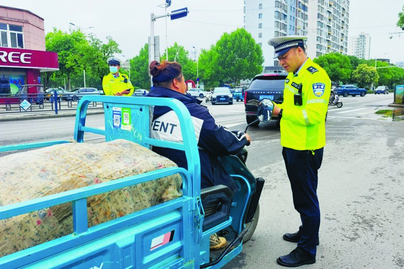 6月2日,市公安局交警支隊田家庵二大隊民警在湖濱路查處騎行兩三輪電動車不佩戴安全頭盔等違法行為。端午節(jié)假期,市公安局交警支隊在全市范圍內(nèi)開展了集中查處交通違法行為專項行動。 (記者 蘇國義 攝)