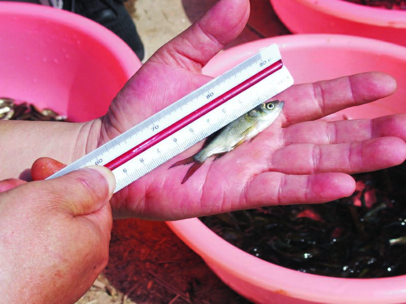 水產(chǎn)技術(shù)人員用尺子確認(rèn)魚苗的長度