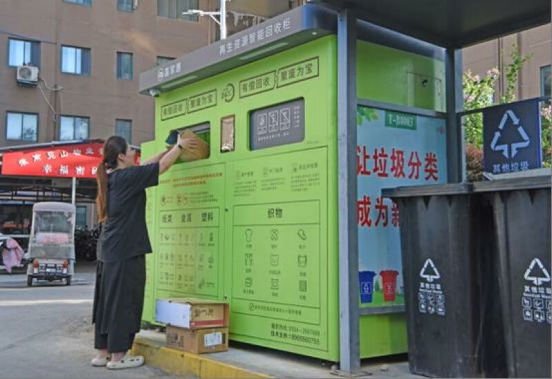 圖二:田家庵區(qū)幸福密碼小區(qū),市民將廢紙箱投入智能回收柜,實現(xiàn)再生資源回收利用。