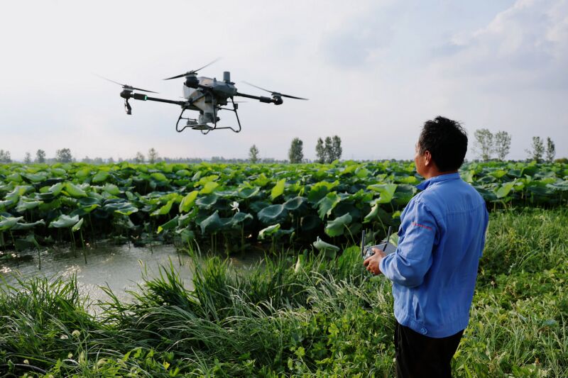 大通區(qū)孔店鄉(xiāng)因地制宜,利用地勢和水系特性,引導農民種植蓮藕、芡實等經濟作物,今年栽種的5000多畝蓮藕長勢喜人。圖為該鄉(xiāng)蔡城塘東岸的農民用植保無人機防治荷塘病蟲害。