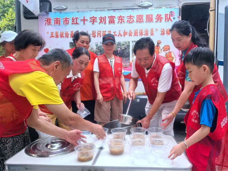 據(jù)介紹,今夏持續(xù)高溫,市紅十字會(huì)多支志愿服務(wù)隊(duì)接力開(kāi)展送清涼活動(dòng)。長(zhǎng)期關(guān)愛(ài)環(huán)衛(wèi)工的市紅十字會(huì)劉富東志愿服務(wù)隊(duì)隊(duì)長(zhǎng)、“淮南好人”劉富東,多年來(lái)堅(jiān)持“冬送溫暖,夏送清涼”。此次,他再次個(gè)人出資5000元,采購(gòu)紅棗、銀耳、米酒、雪梨熬煮清涼粥并添置毛巾、肥皂、口罩,還頂著高溫專程前往梨園,采購(gòu)清甜多汁的丑梨,將物資分裝成一份份飽含心意的“愛(ài)心清涼包”。