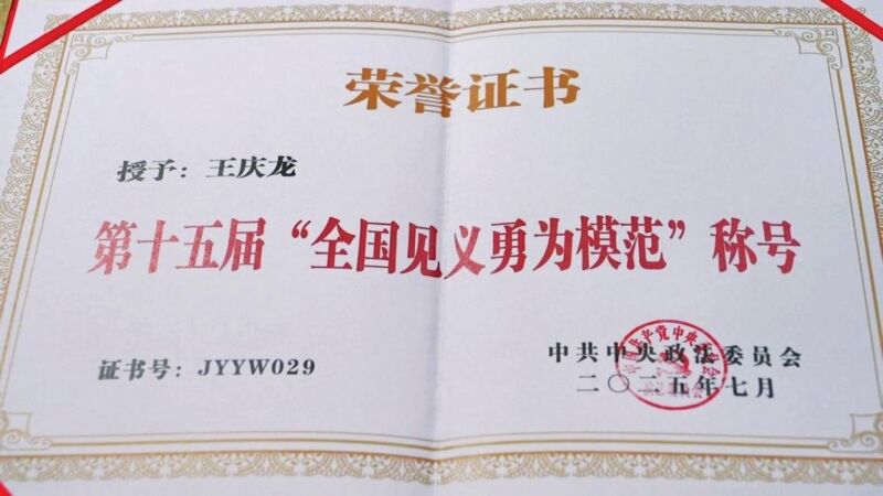 他的事跡迅速在淮南大地傳播開來,收獲諸多榮譽:2022年度榮獲“安徽省見義勇為弘揚正氣獎”一等獎;2023年入選中央政法委“見義勇為勇士榜”與“中國好人榜”,獲評第九屆全國道德模范提名獎;2025年7月,王慶龍被授予第十五屆“全國見義勇為模范”稱號,這份由中共中央政法委員會頒發(fā)的榮譽,是對他舍身壯舉的最高肯定,更是對其一生堅守與擔(dān)當(dāng)?shù)暮裰匕劇?