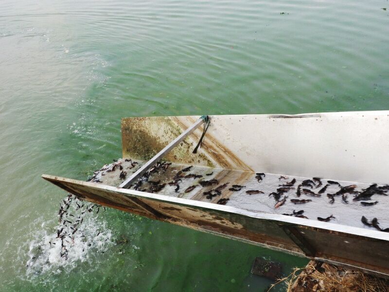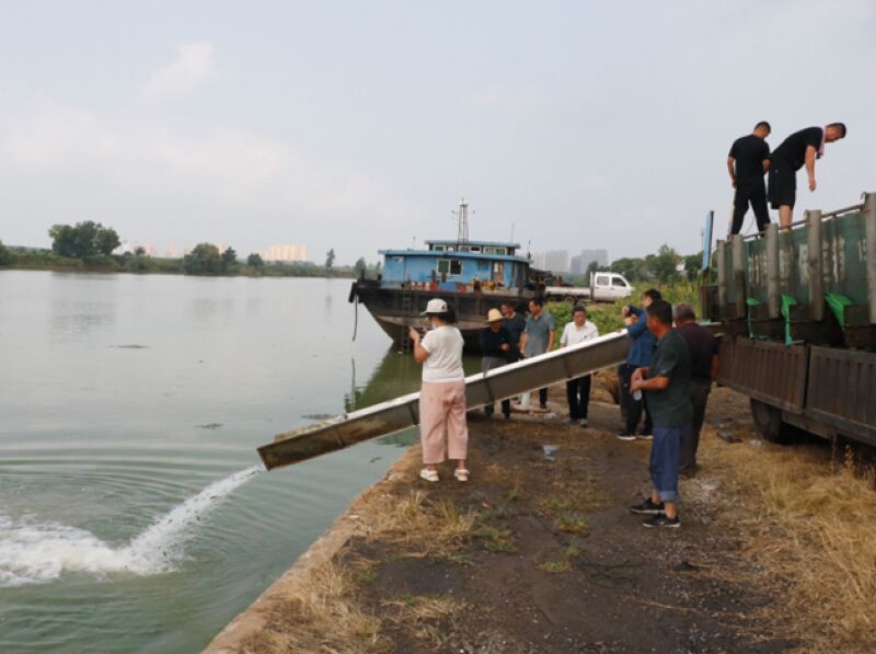 緊隨其后,便是高效順暢的增殖放流作業(yè)。運輸魚苗的車輛緩緩駛至淮河畔,輕輕傾斜車身,便于魚苗隨著水流自然滑入河中。放流人員迅速將車上的出口與不銹鋼槽連接,延伸至河面之上。隨著閘閥的開啟,水聲潺潺,魚兒沿著槽道歡騰跳躍,順暢地融入河水之中。這一過程既保護了魚苗,又確保了較高的成活率,同時提升了放流的效率。