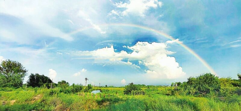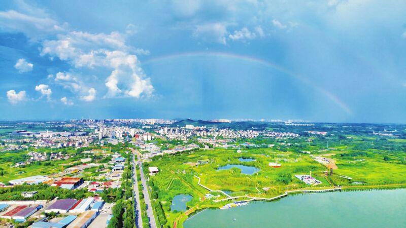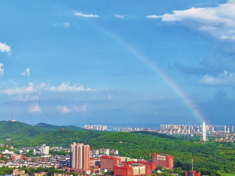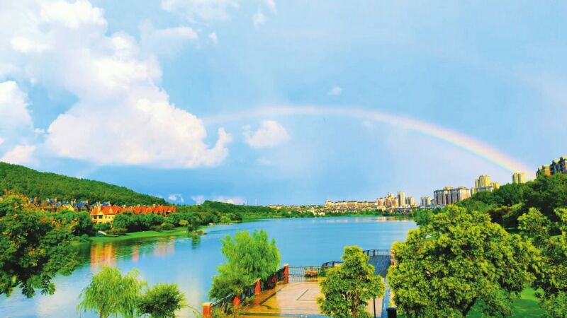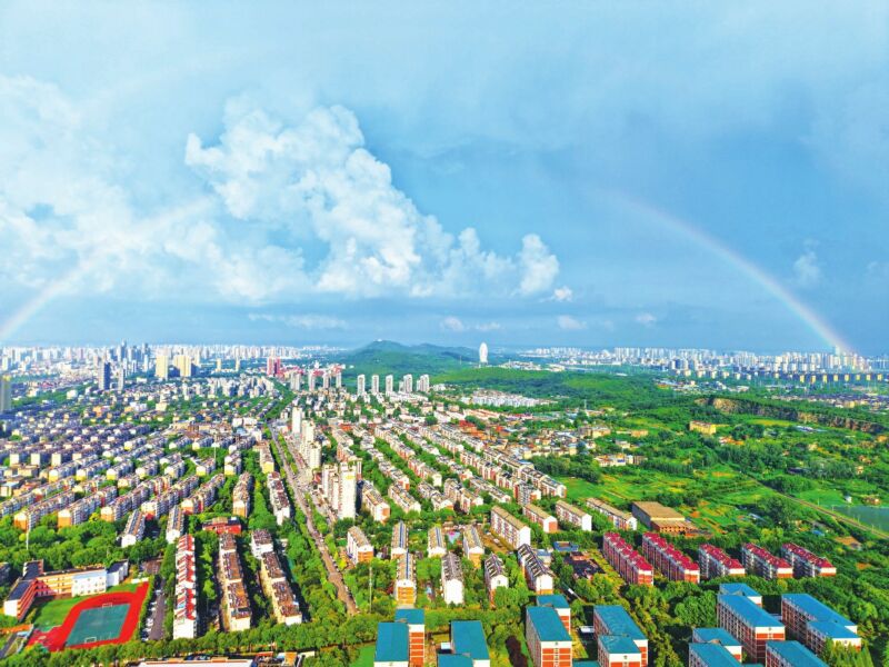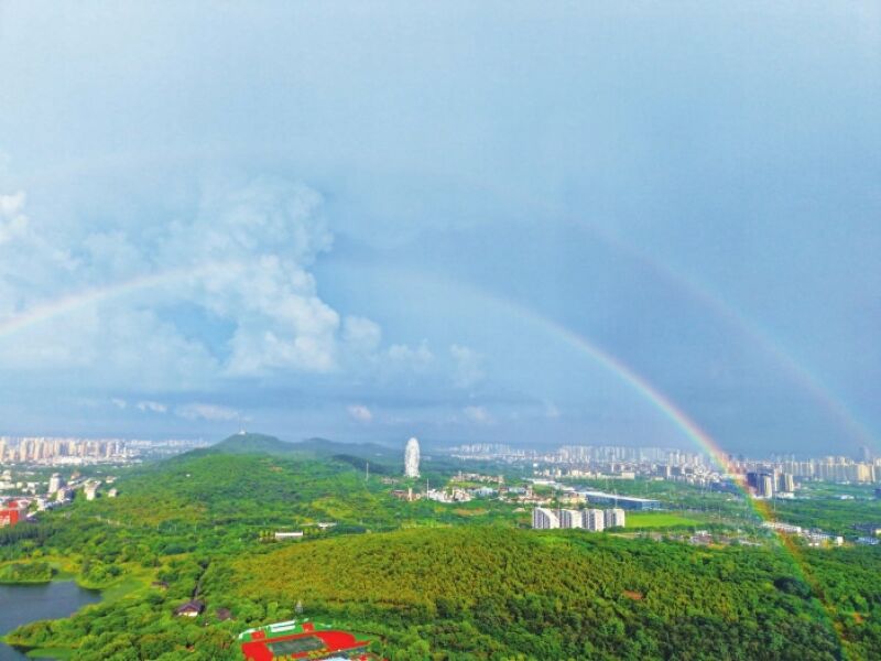 驟雨初歇,淮南的天空被洗練得格外澄澈。倏忽間,兩道瑰麗的虹橋拔地而起,橫跨蒼翠的舜耕山麓,一道沒入淮南高新區(qū),一道垂落田家庵老城區(qū),七色流轉,盡顯靈動好看。