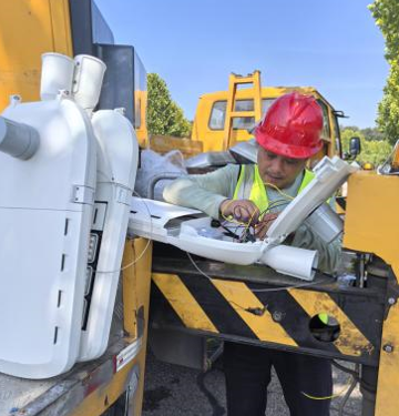 圖為施工人員安裝路燈單燈控制器。(李倩 攝)