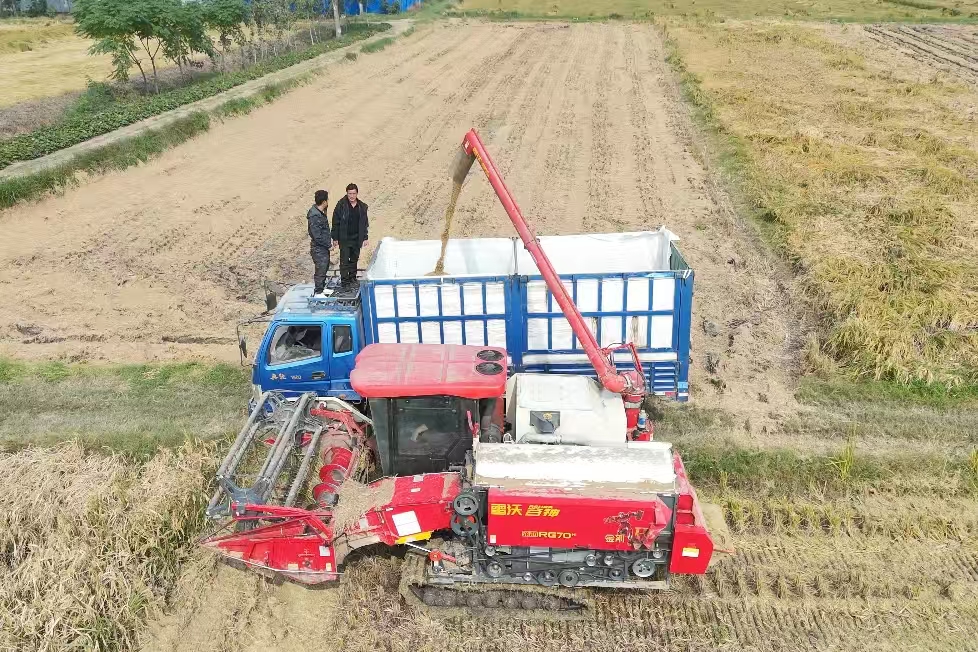 在合作社托管的一片金色稻田里,記者看到,現(xiàn)場(chǎng)機(jī)聲隆隆,一輛輛收割機(jī)來(lái)回穿梭,呈現(xiàn)一派繁忙的秋收?qǐng)鼍。停在田邊的運(yùn)糧車待裝滿后,將稻谷運(yùn)往合作社倉(cāng)庫(kù)進(jìn)行烘干。