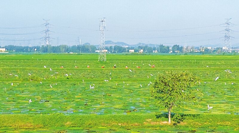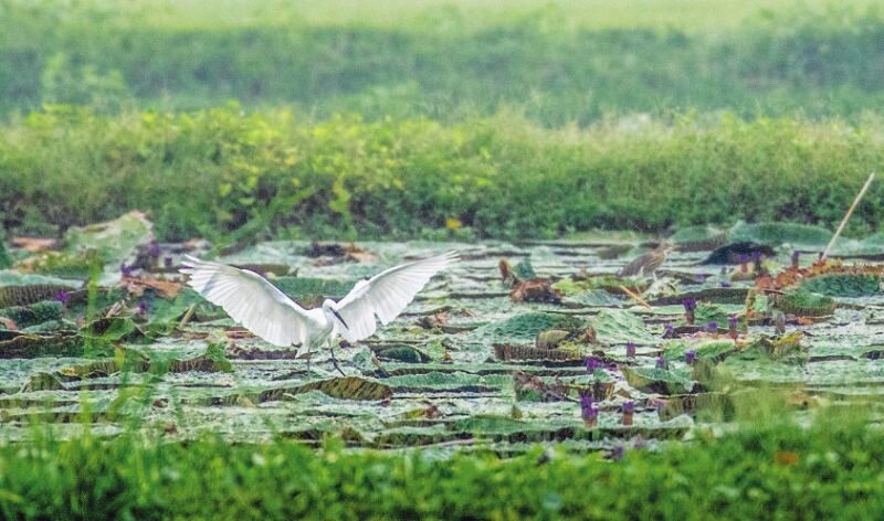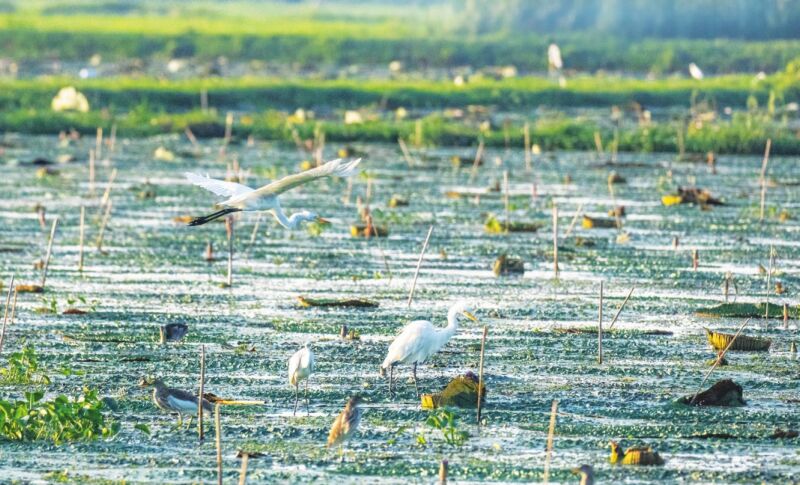 近日,大通區(qū)王樓村芡實迎來豐收,河塘中散落著采收后殘留的芡實,潔白的白鷺被這天然“餌料”吸引,紛紛駐足塘中。時而飛翔尋覓,時而俯身啄食,嬉戲玩鬧,翩躚起舞,構成一幅豐收與生態(tài)共生的鮮活畫卷。