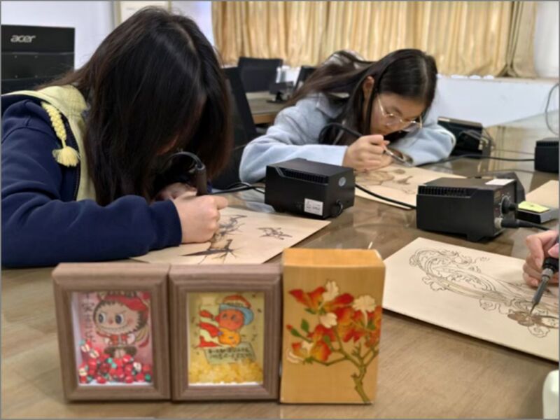 當(dāng)熾熱烙鐵遇上萌趣IP,傳統(tǒng)與潮流便碰撞出奇妙火花——烙畫(huà)筆下的拉布布和星星人,在烙鐵的輕重變幻中顯形,點(diǎn)點(diǎn)烙跡化作星辰微光,硬朗的邊緣被煙火氣柔化,科幻感與傳統(tǒng)韻味交織,讓非遺技藝在萌系世界里煥發(fā)別樣光彩。日前,安徽省工藝美術(shù)大師、淮南烙畫(huà)傳承人鄭紅偉在淮南市職業(yè)教育中心開(kāi)設(shè)了烙畫(huà)課程,帶領(lǐng)學(xué)生用烙鐵燙出現(xiàn)代魅力。