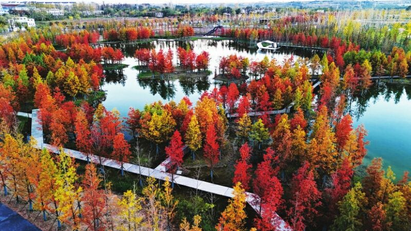 立冬時節(jié),淮南春申湖公園內(nèi)水杉、烏桕等植物五彩斑斕,色彩旖旎,構(gòu)成一幅精美的“油畫”。