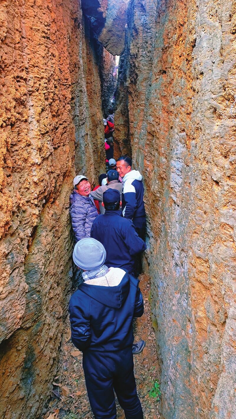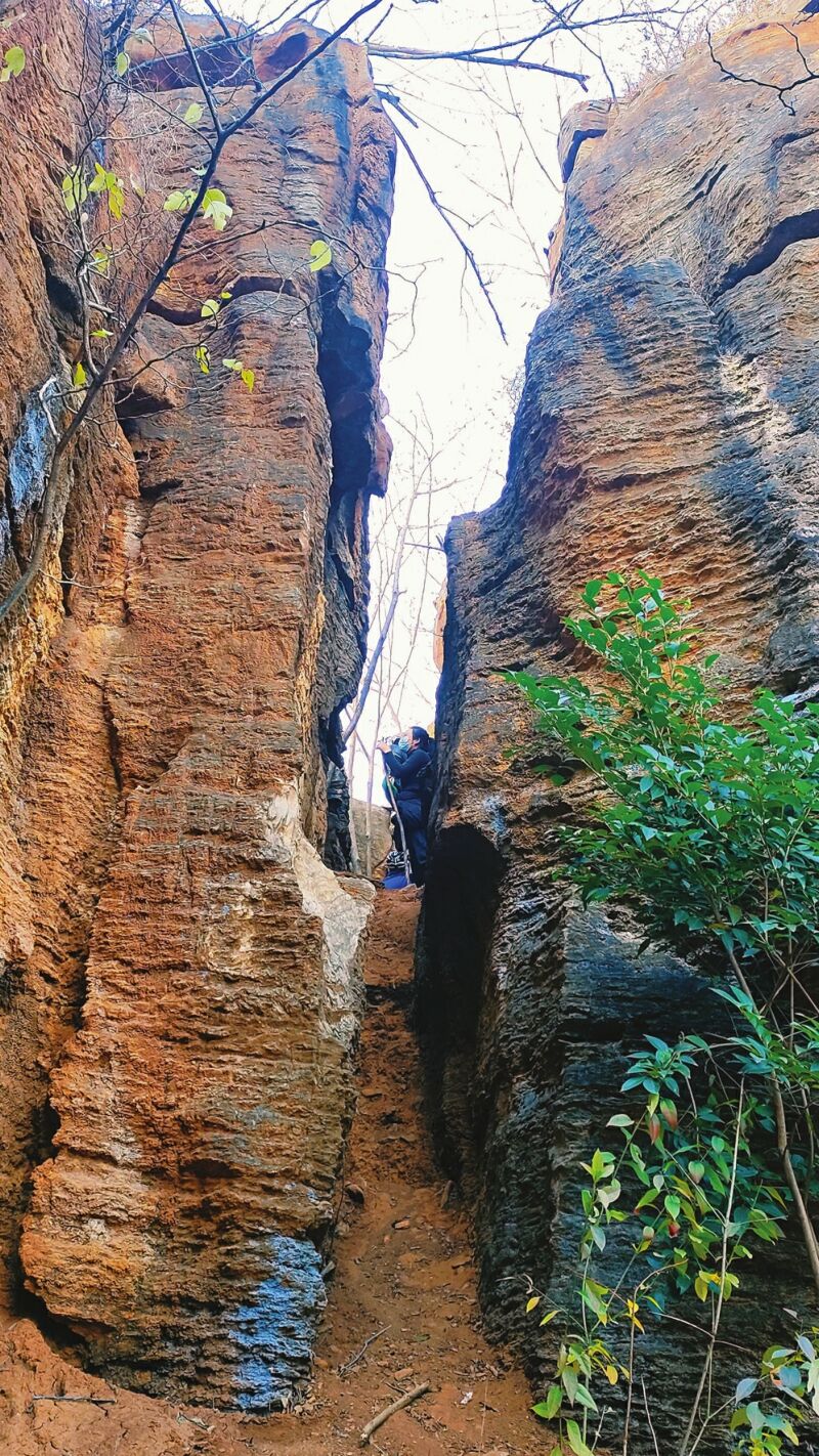 八公山是風光旖旎的歷史文化名山,層巒疊嶂,雄奇靈秀。其南側裂谷是一處獨特的地質景觀,數條幽深裂谷并列,最長的約三十米。如今,這里已成為吸引眾多游客與戶外愛好者的探秘之地,人們穿梭其間,隔谷相呼,樂趣無窮。