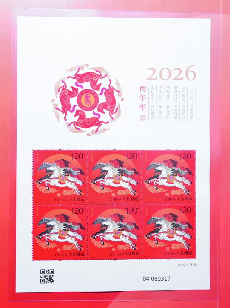 本次發(fā)行的《丙午年》馬年生肖郵票是中國郵政第四輪十二生肖郵票系列的收官之作,它一套兩枚,面值均為1.20元。第一枚名為“馳躍宏圖”,以“騰躍新時(shí)代”為核心意象,展現(xiàn)了一匹紅馬奔馳于祥云之上,鬃毛如焰,四蹄生風(fēng)。第二枚名為“萬駿臻福”,以三匹奔跑的駿馬詮釋“萬馬奔騰、共同奮進(jìn)”的意象。