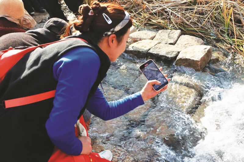 溫泉有三個(gè)泉眼,泉水汩汩而出,嘩嘩流淌。經(jīng)測試,水溫穩(wěn)定在21度左右。溫泉自發(fā)現(xiàn)以來,這片僻靜的荒野陡然人聲鼎沸,游人從四面八方紛至沓來,熱鬧非凡。有人為溫泉冠名為“春申溫泉”,亦有人稱之為“旺淮泉”。