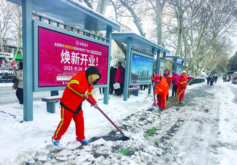 圖二、田家庵區(qū)環(huán)衛(wèi)處職工全員出勤,在主干道、公交站臺及時清除積雪,力保交通通暢。(記者 張越 攝)