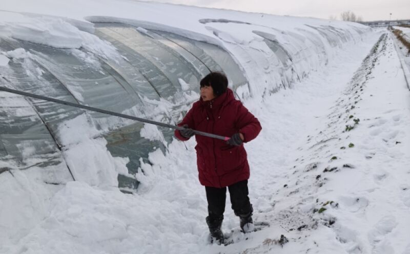 當(dāng)晚,雪越下越大,晚8時(shí)許,務(wù)工村民們來到大棚給其保溫,并準(zhǔn)備好除雪工具。接近子夜,降雪依舊沒有停的跡象,人員全體出動(dòng),為大棚除雪,至次日凌晨3時(shí)多將所有大棚除了兩遍雪。待天蒙蒙亮?xí)r,雪也小了下來,直至雪停,維強(qiáng)家庭農(nóng)場(chǎng)所有大棚未受損失,王奎珍提著的心才慢慢放了下來。