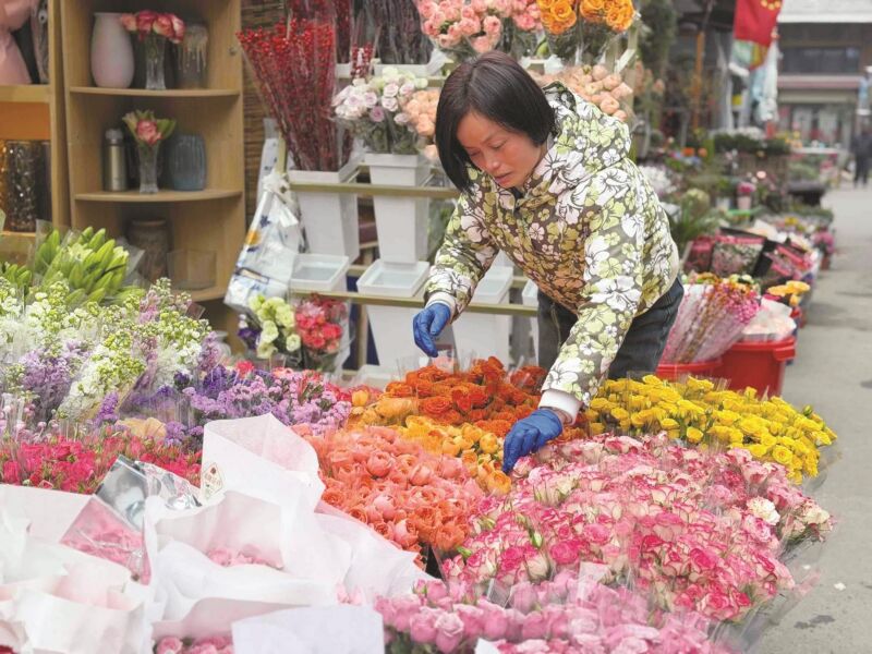 對面的鮮切花攤位上,一位戴藍(lán)色手套的店員正仔細(xì)整理成堆的鮮花。店內(nèi)玫瑰、康乃馨、百合等花束層層疊放,一旁的木質(zhì)貨架擺滿花瓶與裝飾,周圍散落著包裝材料。店主王女士正為兩位老年顧客包扎一束百合,“最近每天都是從早忙到晚,好多顧客一買就是兩三束!彼窒虏煌#χf道。