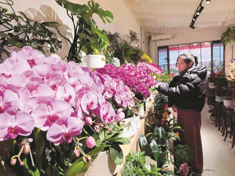 “老板,我要這盆紫色的‘仙客來’……”“好嘞,這就給您裝起來!”近日,店主陶女士正在店內(nèi)整理花卉。她的花鋪中,紫、粉、黃等各種盆栽爭奇斗艷,價(jià)格覆蓋親民到高檔不同區(qū)間。蝴蝶蘭、大花蕙蘭因寓意“幸福到來”而備受喜愛,加之花期較長,成為許多顧客的首選,穩(wěn)居店內(nèi)的“C位”!斑@幾天生意不錯,平均每天能賣出二三十盆,顏色鮮艷、花期長的最受歡迎!碧张恳贿呎砘芤贿呎f。為了備戰(zhàn)春節(jié)銷售,她早已聯(lián)系好上游供貨商,確保節(jié)日期間貨源充足。