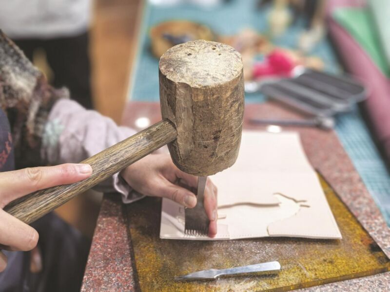 近日,記者來(lái)到李嫚嫚的工作室,皮料特有的氣息彌漫其間,各種皮料與工具整齊陳列。讓一塊原始的動(dòng)物皮料蛻變?yōu)橐患䴗貪?rùn)可用的皮具,其過(guò)程猶如一場(chǎng)靜默的打磨。李嫚嫚詳細(xì)解釋了核心的“硝皮子”工序:需用芒硝反復(fù)浸泡、仔細(xì)清洗,再經(jīng)耐心晾曬,方能將附著油脂血肉的“生皮”轉(zhuǎn)化為柔軟堅(jiān)韌的“熟革”。然而,這僅僅是開(kāi)始。從根據(jù)設(shè)計(jì)挑選平整度與厚度恰到好處的皮料開(kāi)始,到裁切、粘貼、打展、縫線,再到皮面處理與五金裝配,一套完整的作品需歷經(jīng)畫(huà)圖、描圖、裁皮、細(xì)裁等11道工序,而每一步之中,又蘊(yùn)含著無(wú)數(shù)細(xì)致的功夫。案頭擺放的打磨棒、裁皮刀、鏨子、壓邊器等近30件工具,無(wú)聲訴說(shuō)著這門(mén)手藝的繁復(fù)與匠心。