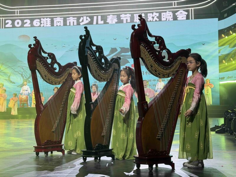 值得一提的是,節(jié)目中箜篌的運用,承載著深厚的地緣文脈底蘊。排練教師陳嘉薇介紹,早在兩千多年前,漢樂府《孔雀東南飛》中便有“十五彈箜篌”的經(jīng)典記述,這種傳統(tǒng)樂器在古代楚地尤為盛行,與淮南的歷史文化肌理深度相融、緊密相連。
