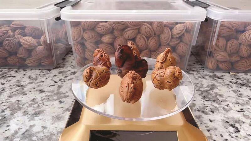 李傳福深耕核雕技藝已有二十余年,自幼受家族木雕、手工編織技藝熏陶,他對八公山本地野生毛桃核懷有深厚情感。為保證原料品質(zhì),每年三四月桃花盛開時(shí),他便進(jìn)山踏勘桃樹位置;待到八月果實(shí)成熟時(shí),他又親自上樹采摘新鮮毛桃核。這些在常人眼中棄之無用的桃核,因顆粒飽滿、紋理清晰、密度極高、入水即沉,成為核雕的上佳材料。在李傳福的巧手之下,普通桃核化身為平安鎖、小元寶、小茶壺、牡丹花等精巧作品,件件靈動(dòng)雅致,成為獨(dú)具特色的指尖藝術(shù)品。