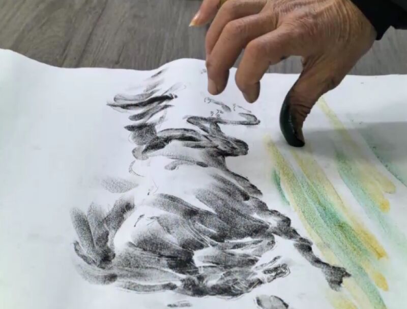 “有時候手癢癢了,就隨手涂畫,后來無意間發(fā)現(xiàn),留下的指紋痕跡,本身就別有韻味!闭劶皠(chuàng)作起源,楊建立笑著說道。這份始于隨性的興致,卻開啟了他一條長達30余年的探索之路。從偶然發(fā)現(xiàn)到有意識創(chuàng)作,如何讓規(guī)整的指紋契合萬物形態(tài),如何掌控力度呈現(xiàn)墨色濃淡,皆依靠無數(shù)次的嘗試與鉆研。指掌常年沾染顏料,畫紙堆疊如山,這門獨特技藝,就在日復(fù)一日的點按之中,從模糊的靈感,成長為清晰的藝術(shù)表達。