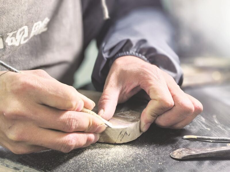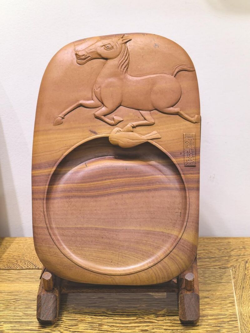 在雕刻技法上,他以浮雕為主,并融入圓雕的刻畫理念。“要在有限的凸起空間里,表現出一匹從各個角度看都生動立體、甚至透著神采的馬,難度很高。”他尤其注重對馬匹肌肉的起伏、骨骼的轉折以及面部神情的細膩打磨。通過反復調整角度與深淺,使光線掠過時,馬的形象產生豐富的光影變化,從而在硯面上營造出強烈的立體感與韻律感。那匹馬,正面看昂首嘶鳴,側面觀奔騰如電,從斜面欣賞,嘴角微揚的神情又透出幾分憨拙與生氣,這正是沈楊楊匠心獨運之處。