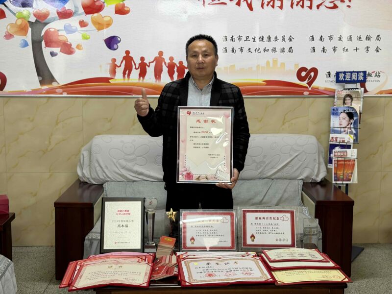 一份份榮譽默默見證著他的無私奉獻:他先后多次榮獲“全國無償獻血奉獻獎金獎”,還獲得代表國家最高褒獎的“全國無償獻血奉獻獎終身榮譽獎”。