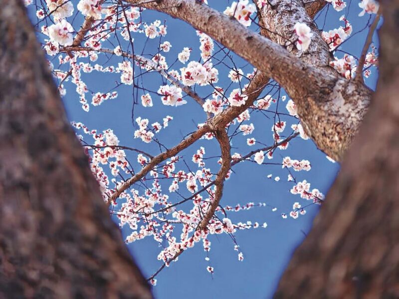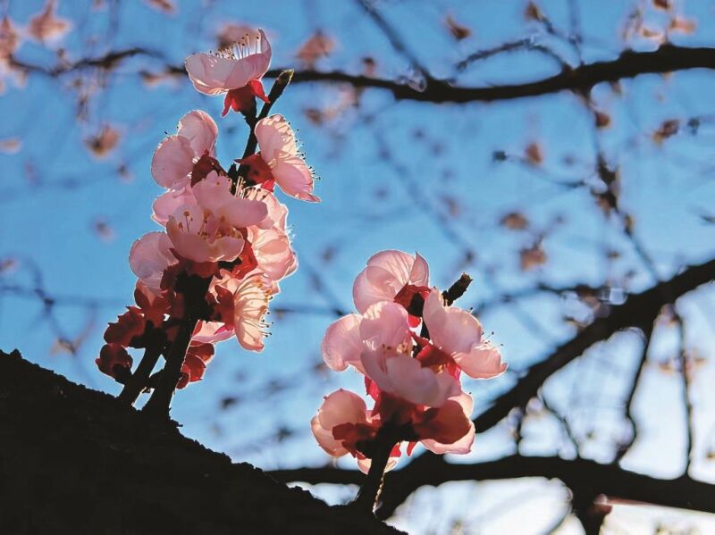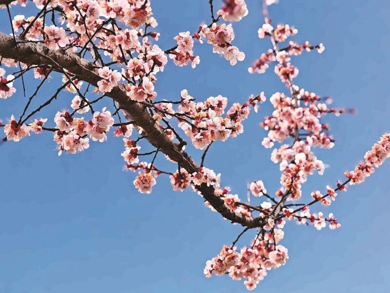 惻惻輕寒翦翦風,小梅飄雪杏花紅。又到春暖花開時,淮南的大街小巷被各色花兒裝點得花團錦簇。漫步洞山新村,杏花已迎春盛放,芬芳馥郁。粉色的花朵密密匝匝簇擁枝頭,如云似霞;微風拂過,花瓣翩翩飄落,宛若一群嬌羞的少女輕舞裙裾,慶賀著春天的到來。
