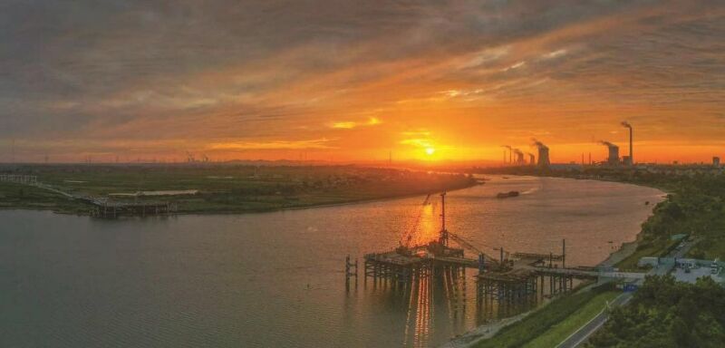 春風(fēng)拂過淮河水面,建設(shè)熱潮在兩岸悄然升溫。鏡頭聚焦建設(shè)中的淮南淮河大橋,橋塔高聳,鋼箱梁錯落有致,鐵臂拔地而起,在寬闊的河面之上勾勒出城市發(fā)展的新輪廓。