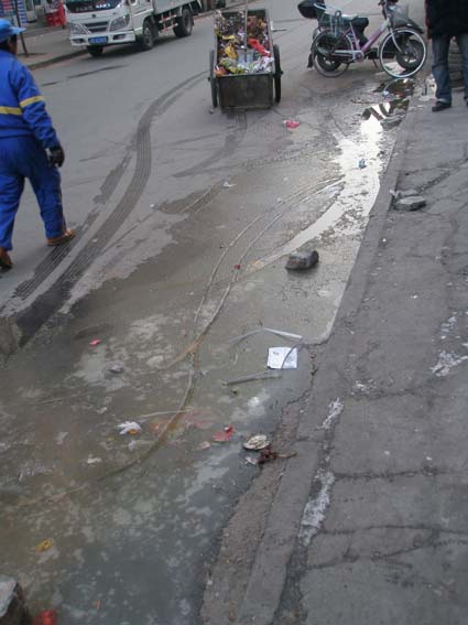 圖為:經(jīng)營戶門前污水已結(jié)冰,嚴(yán)重影響經(jīng)營及市民出行。