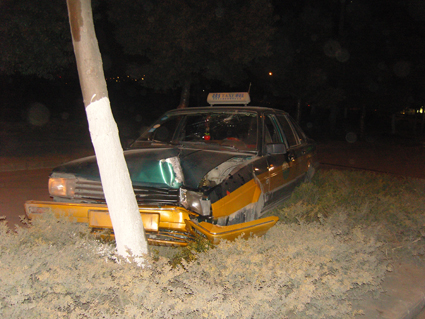 放下電話后,記者馬上驅(qū)車趕到朝陽(yáng)東路與田大路轉(zhuǎn)盤處,遠(yuǎn)遠(yuǎn)地就看見(jiàn)在轉(zhuǎn)盤南面道路右側(cè)的綠化帶內(nèi)停著一輛出租車。記者發(fā)現(xiàn),該車前端撞在綠化帶內(nèi)的樹(shù)上,受損嚴(yán)重,前保險(xiǎn)杠已經(jīng)嚴(yán)重?fù)p壞,前擋風(fēng)玻璃的右側(cè)已經(jīng)破碎。據(jù)司機(jī)本人介紹,由于他沒(méi)有系安全帶,在撞擊發(fā)生時(shí),身體被慣性向前彈出,前擋風(fēng)玻璃就是司機(jī)的頭撞碎的,所幸的是,司機(jī)并未受傷。據(jù)出租車司機(jī)介紹,事故發(fā)生時(shí)他正由北向南正常行駛,突然有一輛自行車逆向行駛,他為了躲避只能急打方向,所以就撞到綠化帶內(nèi)。記者還發(fā)現(xiàn),作為營(yíng)運(yùn)車輛,該車前后牌照均未懸掛,于是記者就問(wèn)司機(jī),為什么不撥打122交通報(bào)警電話,該司機(jī)告訴記者,車輛沒(méi)有買保險(xiǎn),報(bào)警也沒(méi)有用,記者問(wèn)及作為營(yíng)運(yùn)車輛不買保險(xiǎn),發(fā)生事故時(shí),萬(wàn)一車內(nèi)有乘客受傷,該如何理賠,該司機(jī)沉默不語(yǔ)。當(dāng)記者拿出電話欲撥打122報(bào)警時(shí),該司機(jī)拉著記者的手苦苦相勸,不讓記者報(bào)警,這時(shí),又來(lái)了一輛銀灰色無(wú)牌面包車,迅速將事故車輛拖離現(xiàn)場(chǎng)。