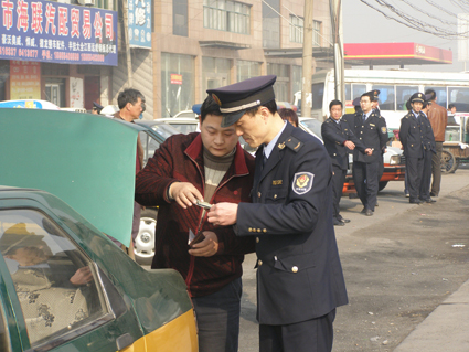 圖:稽查人員正在抽查出租車(chē)的營(yíng)運(yùn)證件。