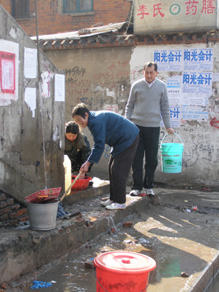 樓下已經(jīng)鬧“水災(zāi)”,可樓上還在鬧“水荒”,張先生家所居住望機(jī)廠(chǎng)西商住樓從臘月二十九到年初八上午,一直停水。據(jù)張先生了解,除了他們的居民樓外,南側(cè)一棟居民樓也同樣停水,大約七八十戶(hù)居民只能在西商住樓西側(cè)臨時(shí)水源處取水,記者在現(xiàn)場(chǎng)看到,不少居民正在取水處排隊(duì)洗菜取水,對(duì)于六層和七層的老年居民來(lái)說(shuō),從這里提水上樓,的確并非易事。張先生告訴記者,今年已經(jīng)是連續(xù)第五年水管凍結(jié)了,原有的水管保溫層被拆除后,管道便一直裸露,所以才年年上凍,希望供水部門(mén)能夠采取措施保護(hù)水管。