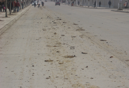 昨日上午,早報熱線記者又一次來到金家?guī)X路和水庫路,仍然看到這兩條路面上殘留著大量的拋灑泥土。
