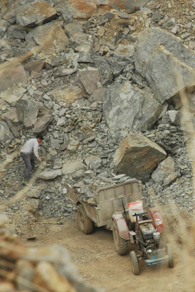 繞過洗砂場,沿著昔日開山取石留下的不平山路往上走,不到200米,記者便遇到一對采石的中年夫婦。只見一輛即將裝滿石頭的拖拉機停在路邊,該夫婦正在挑揀石塊往車斗里扔。