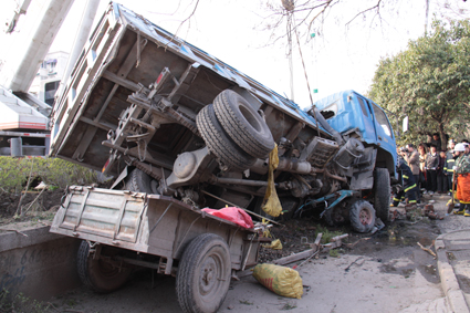 據(jù)介紹交警部門的相關(guān)人員介紹,26日下午4時左右一輛滿載土渣的大貨車沿206國道由南向北行駛時,突然車輛的輪胎發(fā)生了爆胎事故,滿載土渣的大貨車失去控制,沖向路邊的綠化帶后,跌下了落差有一米左右的慢車道,而慢車道正好停放著一輛賣蔬菜的農(nóng)用車,大貨車的整個車身壓在農(nóng)用車上,并將一位行人和農(nóng)用車車主壓在了車身下。