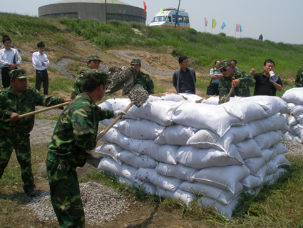 圖為:參加演練人員正在向過濾井填埋碎石,以阻止險情發(fā)生。
