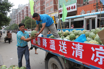 7月13日,鳳臺縣總工會開展送清涼活動,為市容、交警和供電等部門的一線職工,送去西瓜、礦泉水、毛巾、肥皂、白糖等防暑降溫品,體現(xiàn)了縣委、縣政府的關(guān)懷和溫暖。圖為市容系統(tǒng)的職工在搬運西瓜。