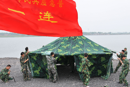 圖為應(yīng)急連民兵正在進(jìn)行一線防汛指揮部搭建演練。