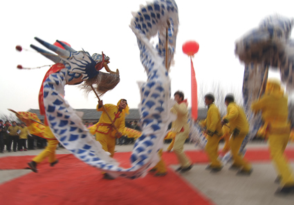 2011年新春佳節(jié)即將來臨,鳳臺縣新集鎮(zhèn)陳巷村以豐富多彩的鄉(xiāng)土文化表演活動,來活躍村民們的節(jié)日生活。圖為精彩的舞龍場景。