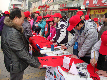 29日14點(diǎn)30分,記者聞訊趕到家樂福時代廣場時,立即被眼前愛意濃濃的一幕感動了:一個感人肺腑的巨幅背景架、一排簡單的桌子組成了這個義賣現(xiàn)場。學(xué)生們站在桌子后或賣力叫喊,或埋頭寫字,他們的臉被寒風(fēng)吹得通紅,他們的手在寫字時打著顫,可這都無法影響他們堅持義賣的決心。不少市民也被他們的愛心和執(zhí)著所感動,紛紛走到桌邊慷慨解囊。雖然義賣的每幅春聯(lián)只要2元,可不少市民只拿了一幅春聯(lián),卻放下了十幾元錢。