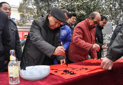 1月28日上午,淮南市老年書畫聯誼會和龍湖公園在公園南門聯合舉辦了“2011年迎新春義務寫春聯”活動。10多名書法家現場潑墨揮毫。一副副紅色的對聯洋溢著新春佳節(jié)的喜慶,也為廣大市民游客送上新春的溫馨祝福。
