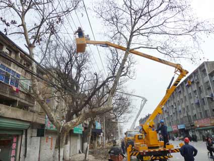 樹障一直是影響城鄉(xiāng)居民安全正常用電的最大障礙。為解決樹線矛盾,淮南供電公司配電工區(qū)主動(dòng)與市園林部聯(lián)系,在征得主管部門認(rèn)可的情況下,集中兵力,對城鎮(zhèn)主要干道全面開展清障工作,不僅為線路安全運(yùn)行打開了通道,也為“迎峰度夏”高峰用電的到來鋪平了道路。圖為配電工區(qū)利用高架車進(jìn)行清障工作。