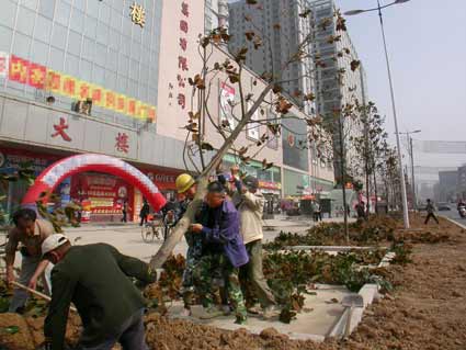 我市大建設(shè)重點(diǎn)工程之一的龍湖路改擴(kuò)建項(xiàng)目,經(jīng)過各方施工單位的努力,現(xiàn)已接近尾聲,地下商業(yè)街即將開業(yè),道路設(shè)施也逐步完善。圖為4月10日下午施工人員正在龍湖路上植樹綠化的場(chǎng)景。