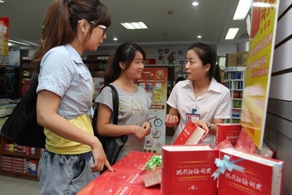 圖為淮南新華書店工作人員正在向顧客介紹新版《現(xiàn)代漢語詞典》。