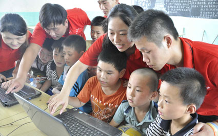圖為大學(xué)生志愿者向毛集實(shí)驗(yàn)區(qū)留守兒童傳授電腦知識(shí)。