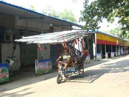 7月18日,記者在市委基地小街看到,一名男子騎著一輛三輪車在道路上行駛。讓人大跌眼鏡的是,男子在車斗中搭了架子,架子頂上則堆積著多塊不銹鋼門,由于門又大又重,三輪車顯得頭重腳輕,車一走,上面像蹺蹺板一樣起伏。看著男子小心翼翼地蹬著三輪車,路過的市民不禁為他捏了一把汗。