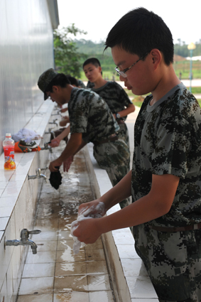 圖一:7月22日,淮南一中高一新生在淮南市國(guó)防動(dòng)員訓(xùn)練基地進(jìn)行隊(duì)列訓(xùn)練。圖二:一名參加軍訓(xùn)的高一新生臉上掛滿了汗珠。圖三:一名參訓(xùn)新生利用訓(xùn)練間隙洗襪子。